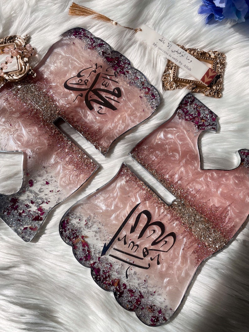 The Pink & silver Resin Quran Book Holder (Rehal) is a handcrafted masterpiece that unites deep spiritual symbolism with a lavish, striking design. It features a high-gloss emerald Pink resin base, adorned with elegant silver Arabic spiritual calligraphy and shimmering silver foil accents.